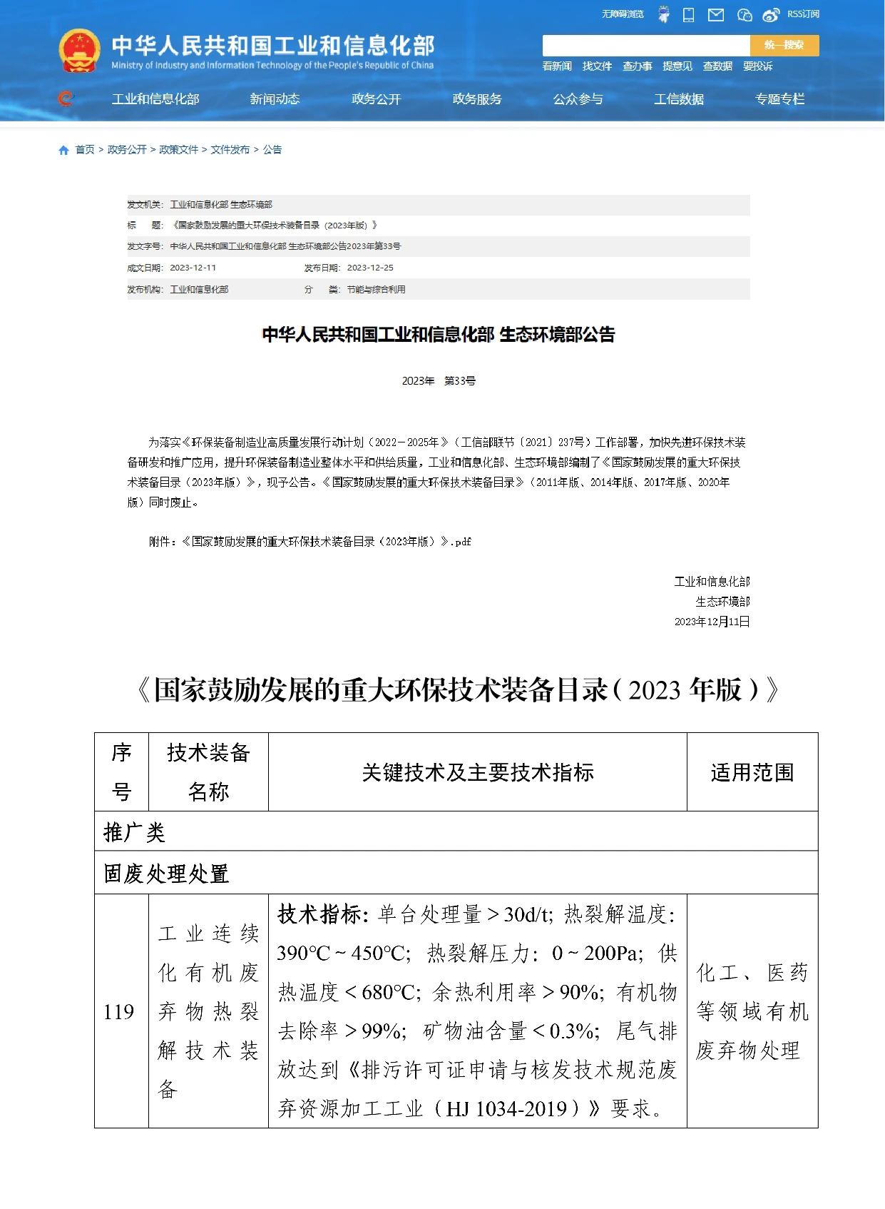 近日,經(jīng)省級有關(guān)主管部門及相關(guān)行業(yè)協(xié)會推薦、專家組評審等,工業(yè)和信息化部、生態(tài)環(huán)境部共同組織發(fā)布《國家鼓勵發(fā)展的重大環(huán)保技術(shù)裝備(2023年版)》,恒譽環(huán)保“工業(yè)連續(xù)化有機廢棄物熱裂解技術(shù)裝備”成功入選,這是恒譽環(huán)保科研成果連續(xù)第3次入選該目錄,標(biāo)志著公司技術(shù)研發(fā)實力再次獲國家相關(guān)部委的高度肯定。
