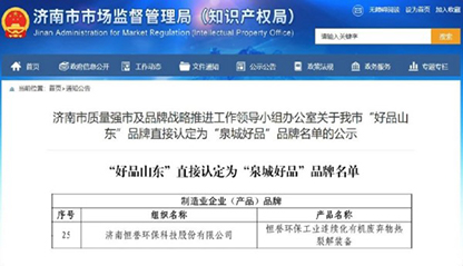 2024年7月公司主導(dǎo)產(chǎn)品“工業(yè)連續(xù)化有機(jī)廢棄物熱裂解裝備”入選濟(jì)南市市場監(jiān)督管理局認(rèn)定的第一批“泉城好品”;